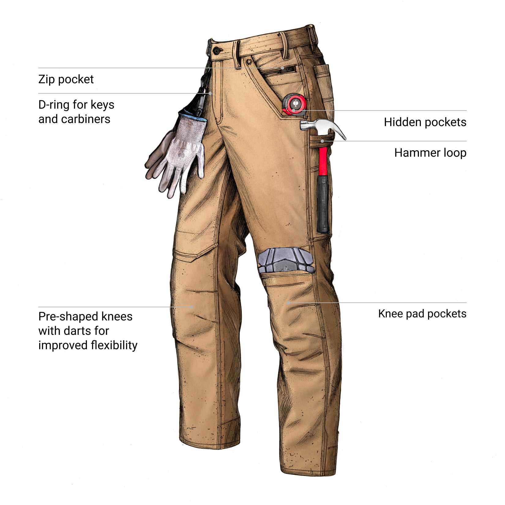 - Knee pad pockets with reinforced fabric extending to the hem, secured with a hook-and-loop flap closure
