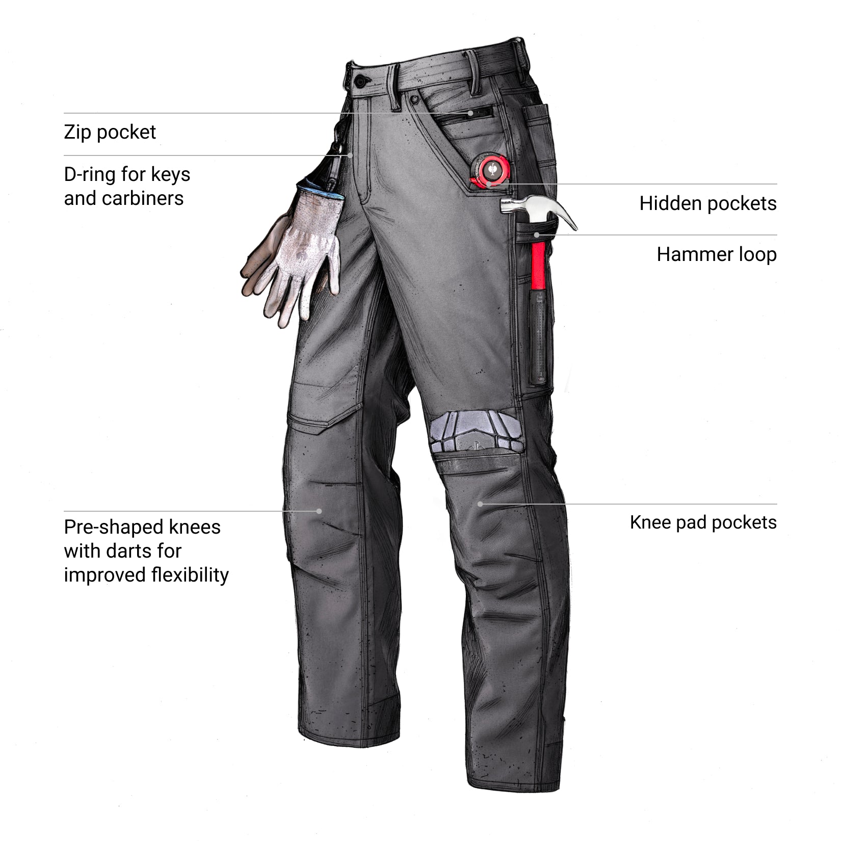 No more holes. No more frayed seams. These pocket protected pants are perfect for those who keep their gear close at hand. Designed for durability, these work pants feature a relaxed fit, triple-stitched main seams, and pre-shaped knee darts with knee pad pockets for added protection. The key to these pants is in the pockets — each one is reinforced with 100% polyamide, ensuring they withstand the toughest tasks.