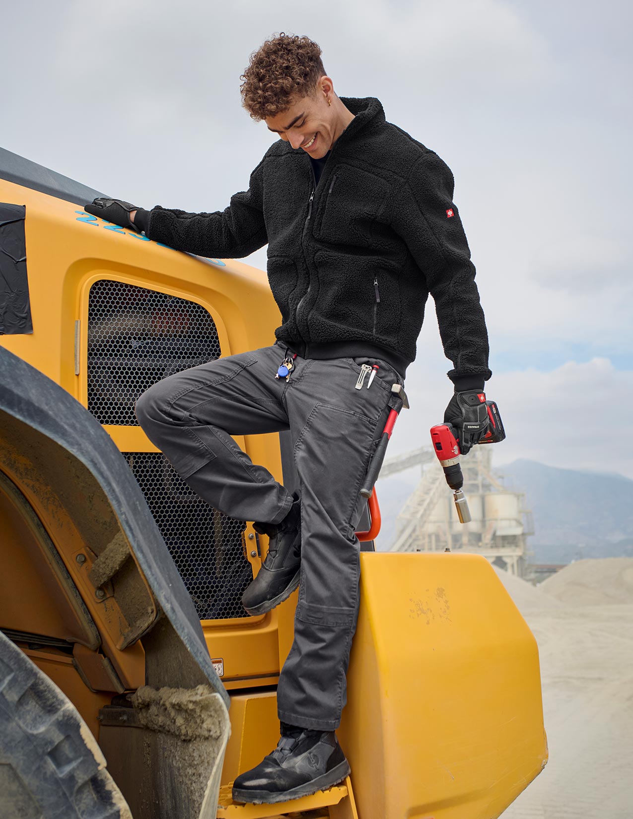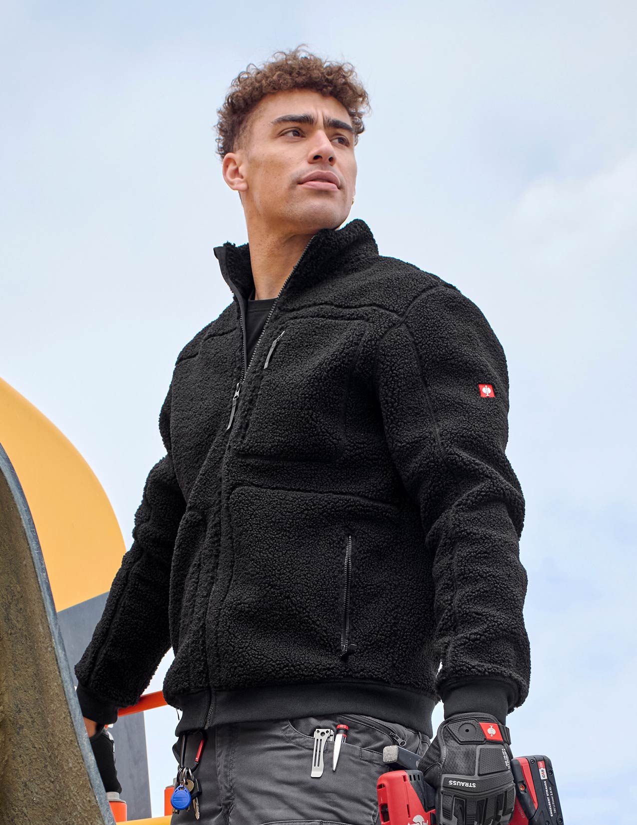 Warmth and work-ready utility combine in this Sherpa fleece jacket. The classic fluffy exterior combines with a warm fleece interior to handle chilly days. The relaxed, baggy fit allows you to layer up while wearing the jacket. Of course, details like decorate flatlock seams and smooth linings add a stylish touch.