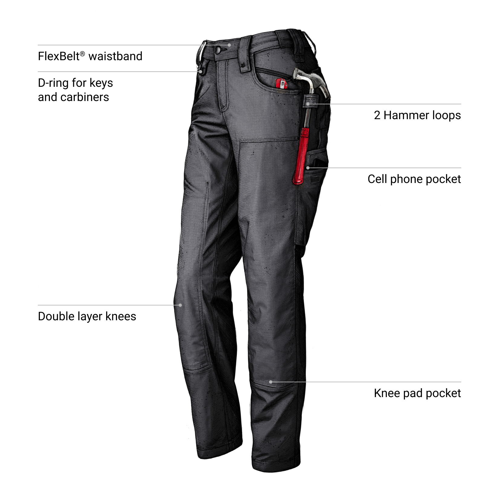 A perfect match in design and functionality, these work pants are cut to a looser, relaxed fit and are built for a wide range of environments where you'd like peak performance but with a more traditional work look. The ripstop fabric is extra lightweight and durable compared to your standard canvas work pants. The Flexbelt® waistband moves with you while you work. The pants also feature an extra layer on the front for improved durability as well as knee-pad pockets for the STRAUSS knee pads.