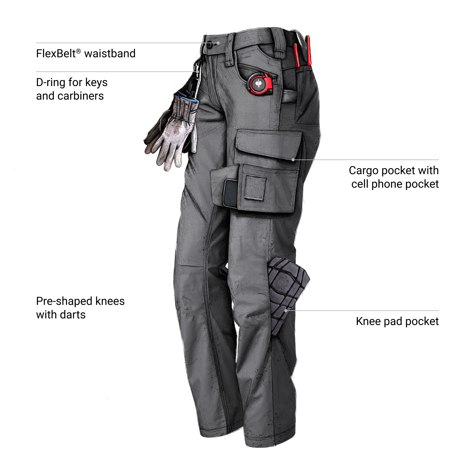 - Hidden pockets on both legs for attaching a tape measure and knife with clip