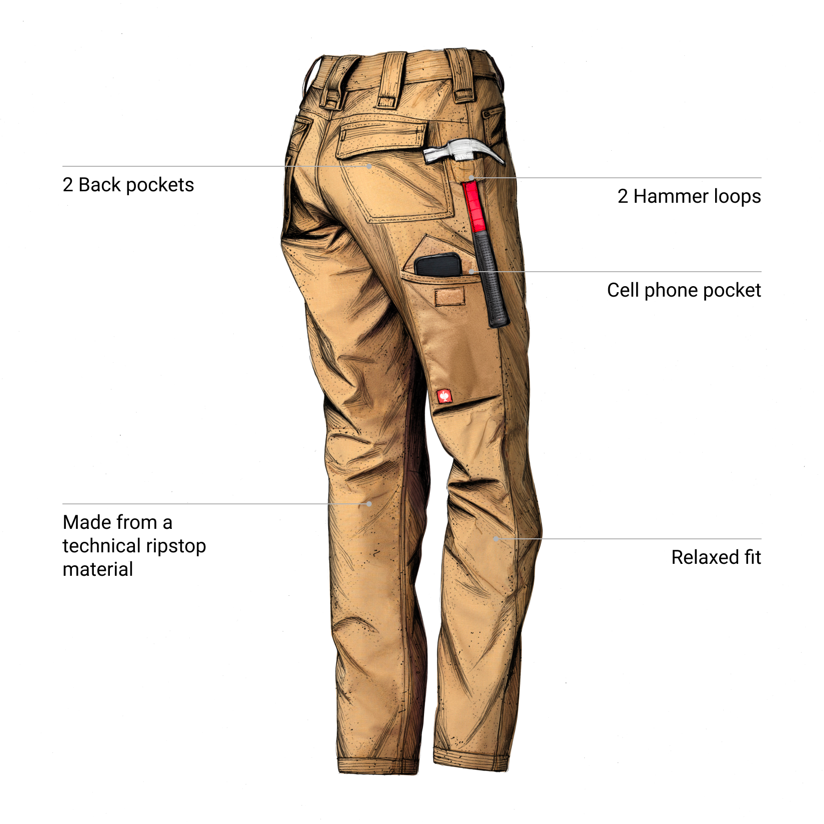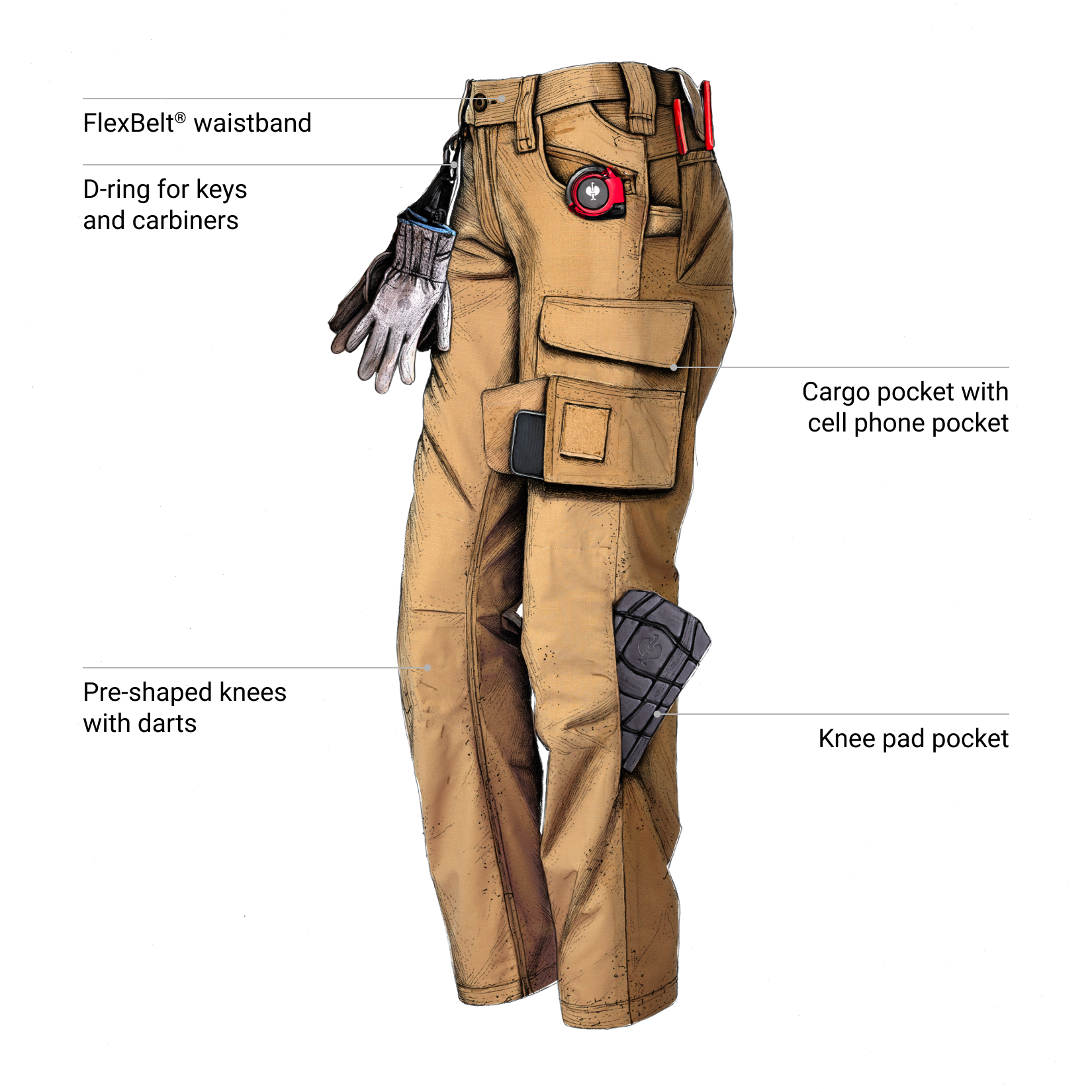 - Hidden pockets on both legs for attaching a tape measure and knife with clip