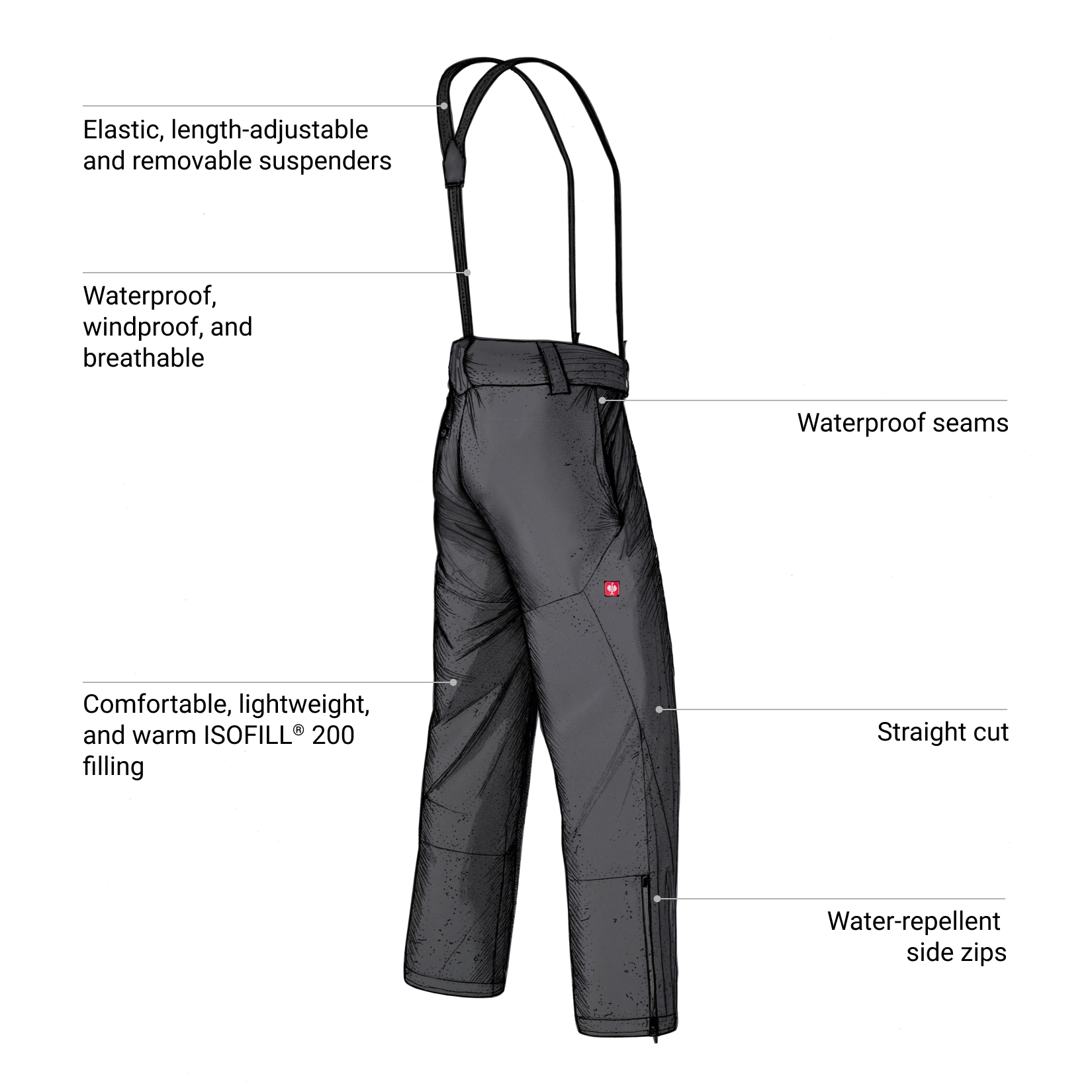 - Pant leg ends with water-repellent, side zips for easy handling with ski and winter boots