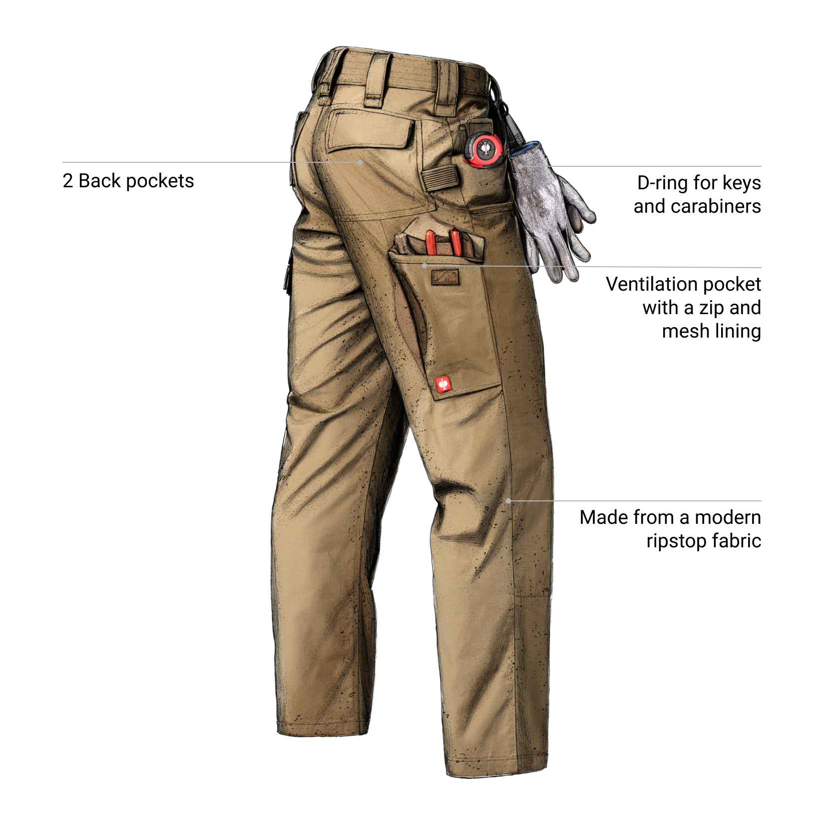 - hidden pockets on both sides for attaching a tape measure and knife with a clip