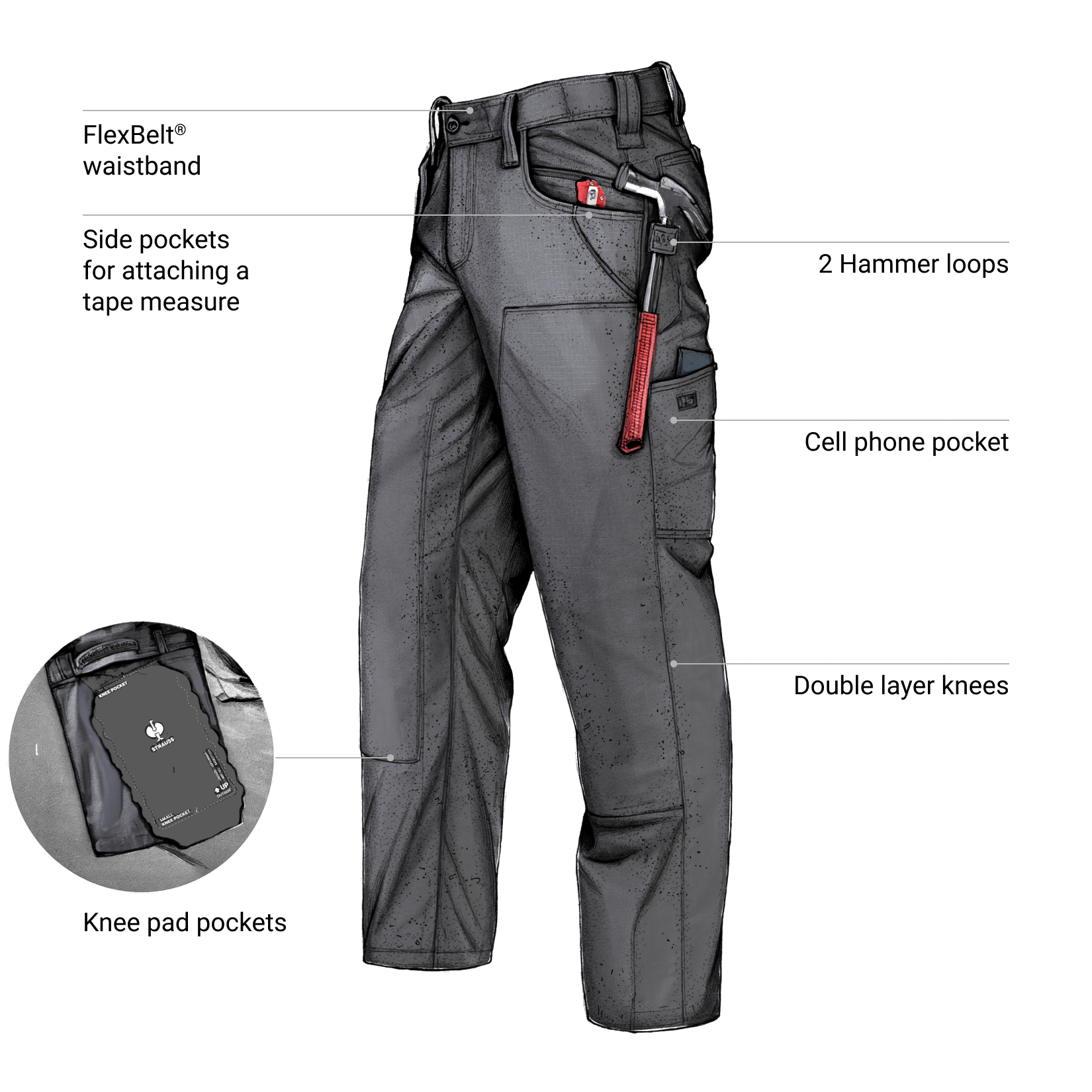 - both back pockets have a hammer loop on the side