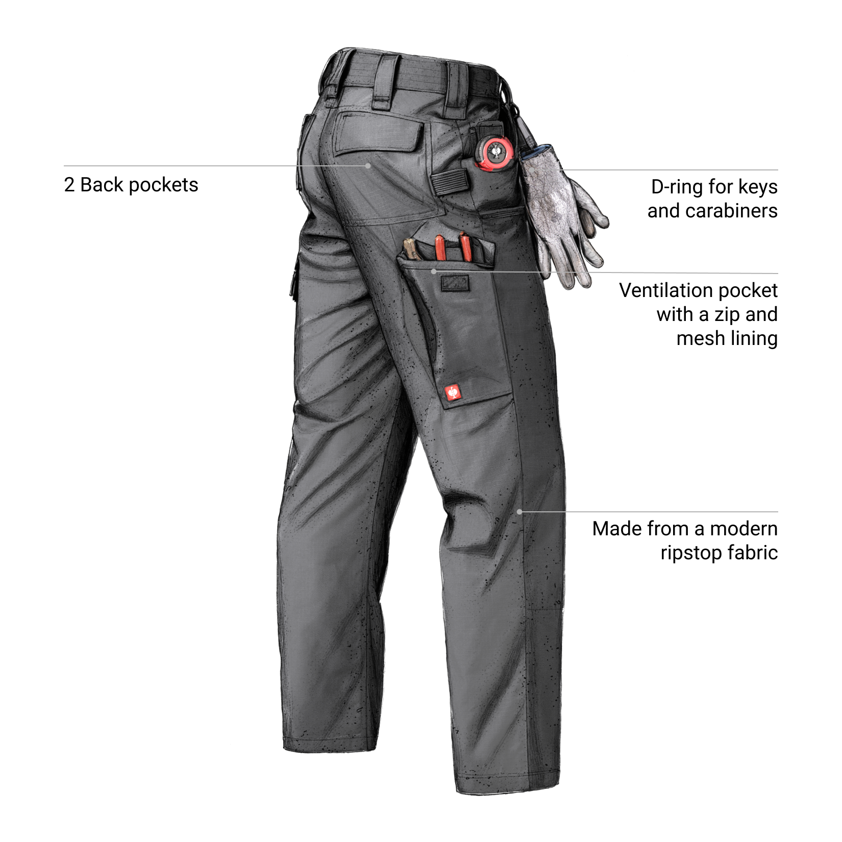 - hidden pockets on both sides for attaching a tape measure and knife with a clip