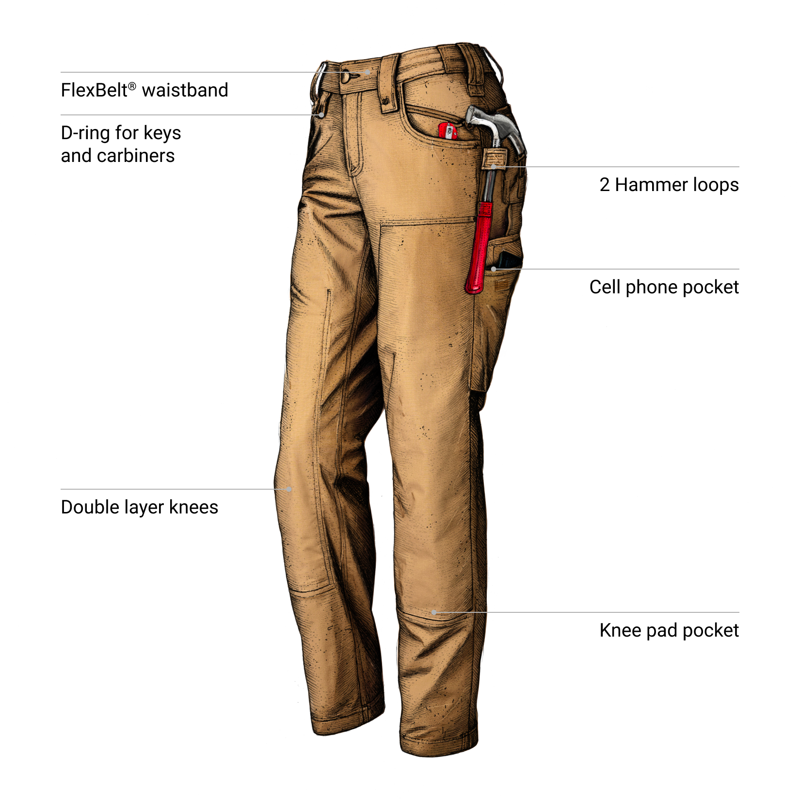 • Ambos bolsillos traseros tienen una presilla para martillo en el lateral