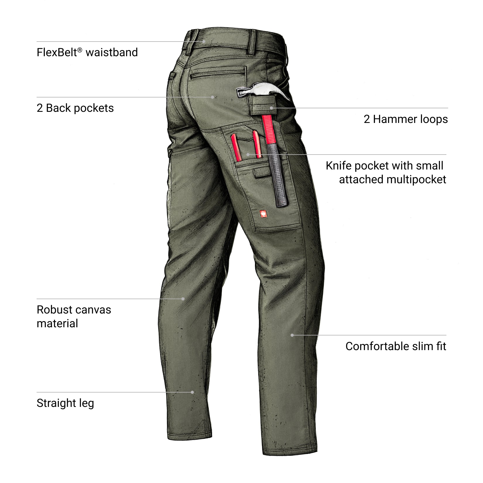 - 2 hammer loops (right + left next to rear trouser pockets)