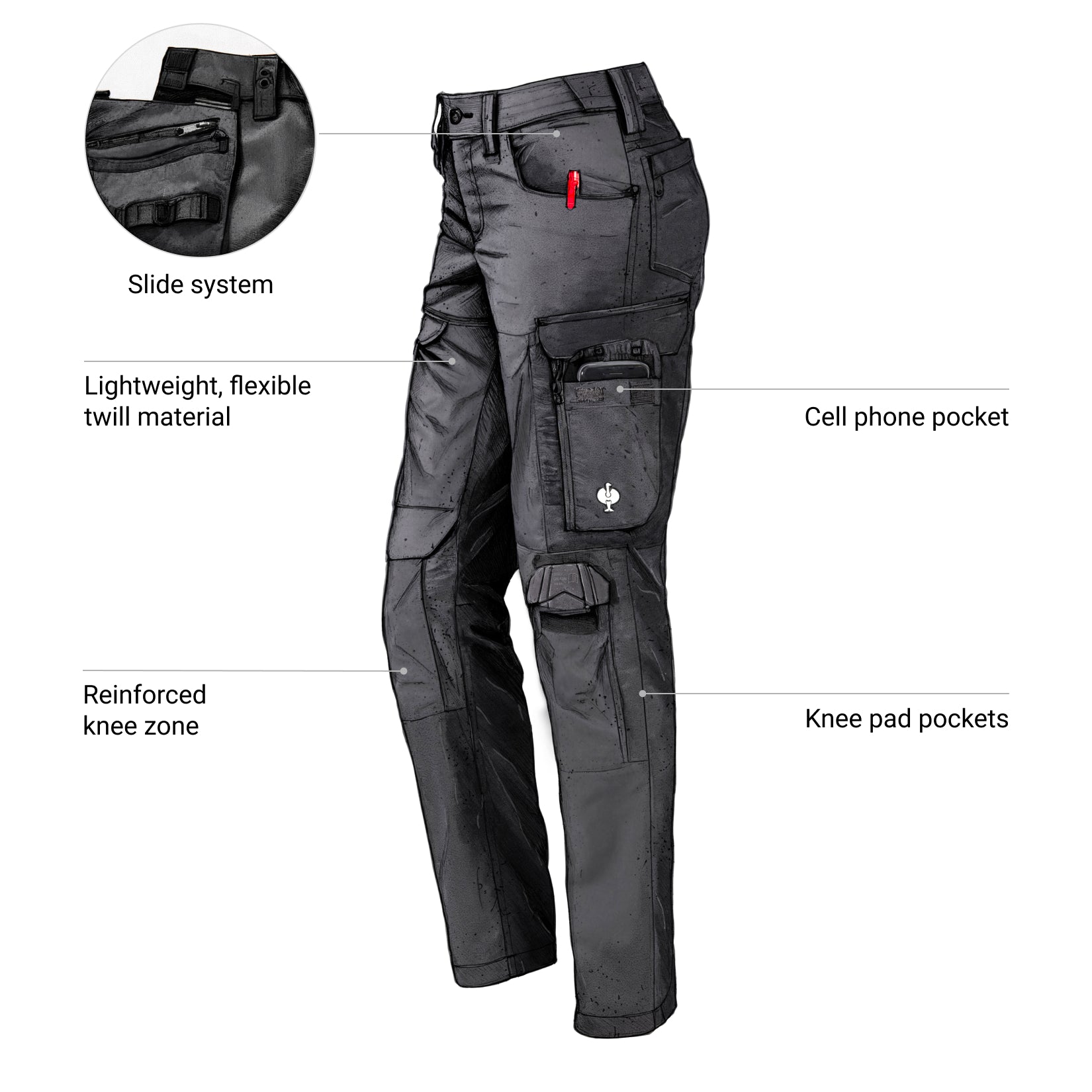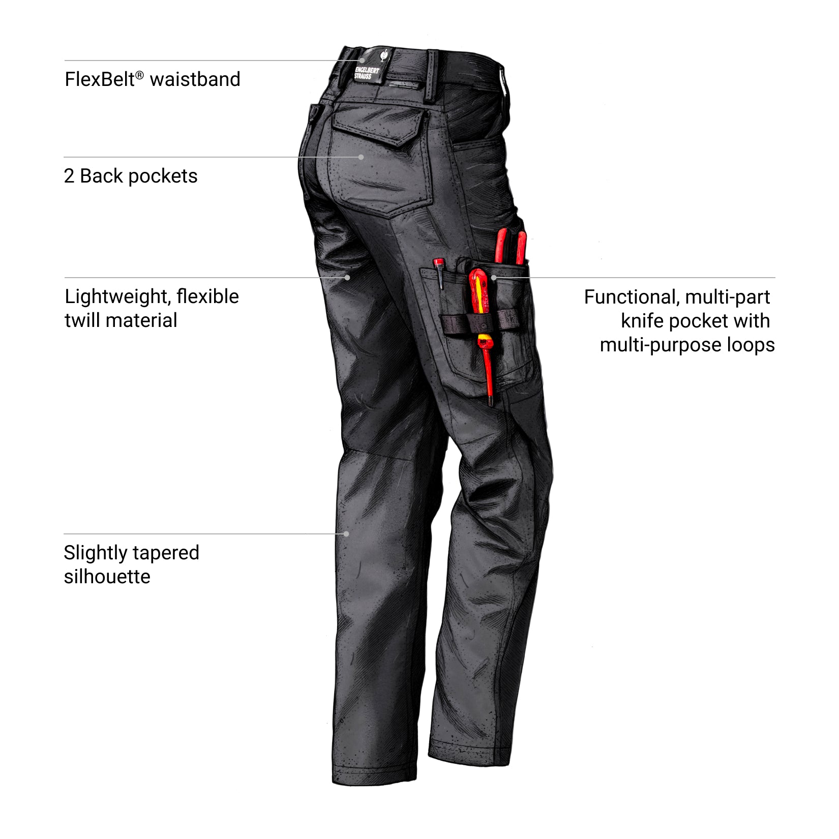 Made with a cotton, stretch, and polyamide twill fabric, the Work Pants e.s.concrete light resist wear while feeling fantastic. The Flexbelt® waistband adds to the comfort, while multi-purpose pockets and loops provide space for your tools and phone. You can even add a separate tool pocket on either side via the clever slide system. The knees are reinforced and feature pad pockets for adding protection only when you need it.