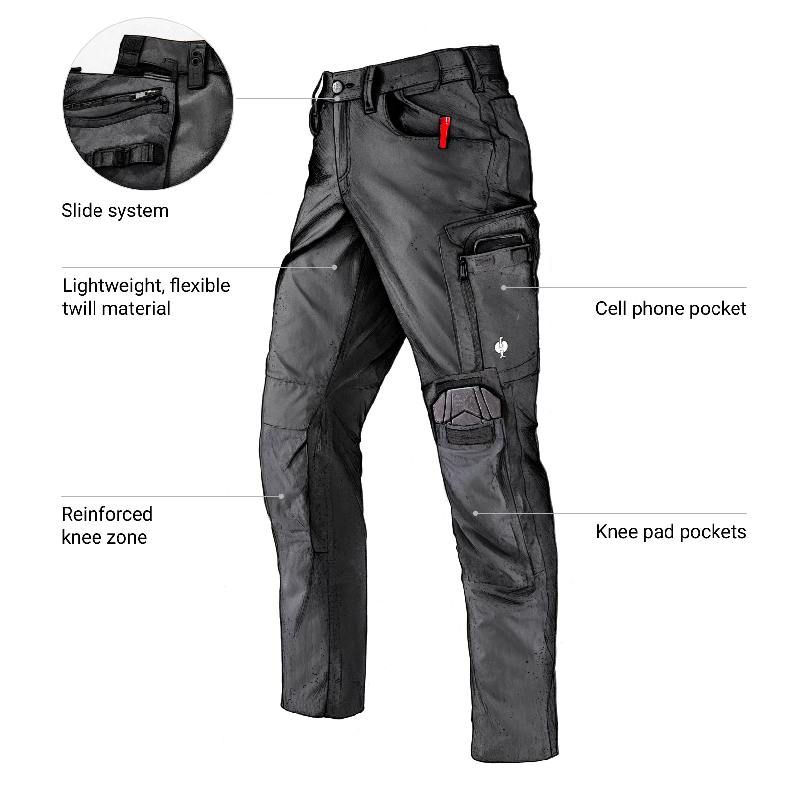 - Concealed top-loading knee pad pockets