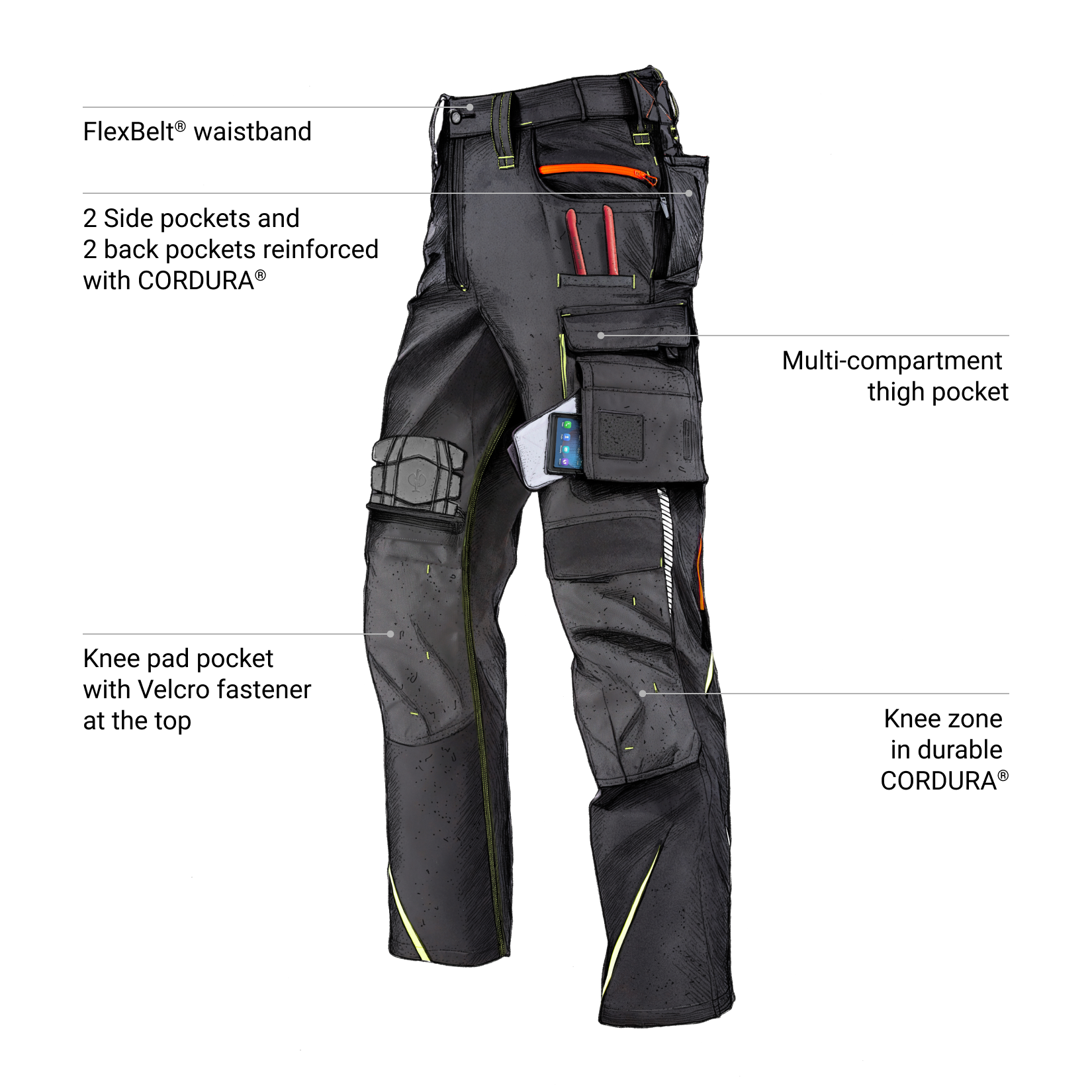 Built to get the job done, the Cargo Work Pants e.s.motion 2020 unite flexibility and durability. The Flexbelt® waistband and elasticated side elements free your movement, while CORDURA® knee zones and a triple-stitched inside leg seam ensure these pants stand up to the toughest of work. If things get strenuous, there are zipper vents on the back of both thighs. Knee pad pockets allow you to add protection only when you need it.